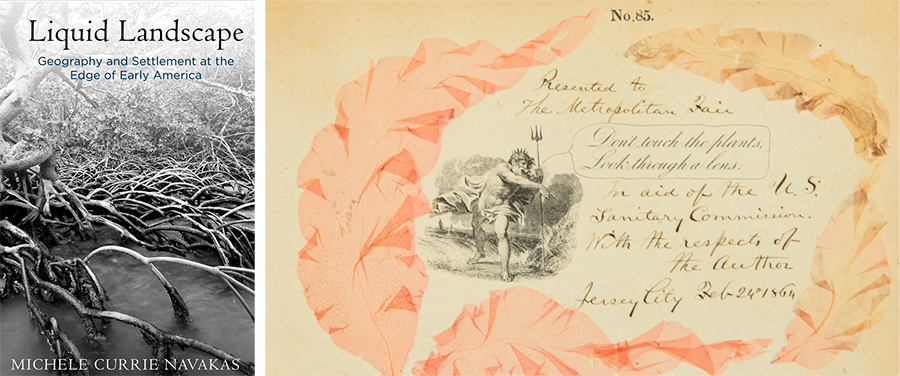 Left: In her first book, Liquid Landscape: Geography and Settlement at the Edge of Early America (University of Pennsylvania Press, 2018), Michele Navakas analyzes the history of Florida’s incorporation alongside the development of new ideas of personhood, possession, and political identity. Reading a vast archive of texts spanning Revolution to Reconstruction, Navakas uncovers an alternative history of American possession not descended from conceptions of American land as enduring, solid, and divisible. Right: Nestled among the 293 seaweed specimens in Algology is a placard with an engraving of Neptune, who warns readers, “Don’t touch the plants. Look through a lens.” Durant must have pasted this placard in the book to preserve the samples from the hands of eager readers. The placard also identifies The Huntington’s copy of the book as a gift “Presented to the Metropolitan Fair in aid of the U.S. Sanitary Commission. With the respects of the author. Jersey City Feb 24, 1864.”