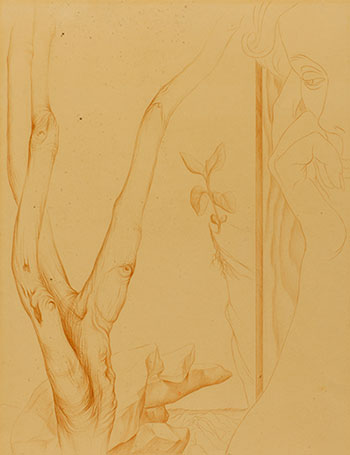 With longtime partner and later husband Lorser Feitelson, an abstract painter, Helen Lundeberg was a figure of note in the Los Angeles art scene from the 1930s until her death in 1999. The Huntington's Irises (The Sentinels) dates from her breakout decade, the 1930s, when her artworks contained an assortment of flagellum-propelled, cell-like bodies, carnivorous plants, distant galaxies, planets, optical instruments, and self-portraits. A drawing of hers at The Huntington shows her in profile on the right, as if she were dreaming up a mindscape of branches and flowers.