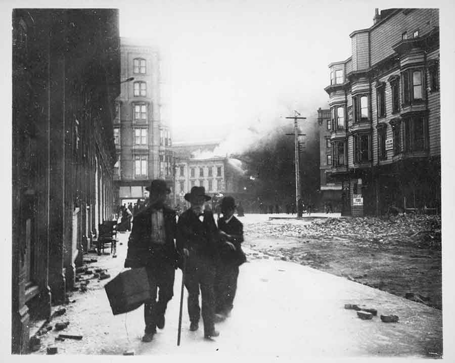 A photograph captures what happened next. Gingerly, Watkins walks along a sidewalk toward Russian Hill or Nob Hill, toward somewhat safer ground. Bricks that had fallen off the front of the building to Watkins’s right litter the sidewalk. A few feet in front of him, the crumbled front of another building covers the street. There are flames in the windows of the Beaux-Arts building behind Watkins. Thick black smoke streams from its roof.