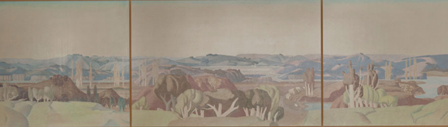 The Rankes commissioned the mural for the dining room of their Hollywood Hills home. The elegant painting depicts, in soft and subtle tones, a pastoral California panorama with rolling hills, a lake and its tributaries, and a shepherd tending his flock. Larry McFarland and M. Todd Williamson, the current owners of the Ranke home, donated the mural to The Huntington to preserve the work of a man whose native landscape inspired and shaped his artistic vision, and to draw attention to a long-hidden side of an artist we thought we knew so well.