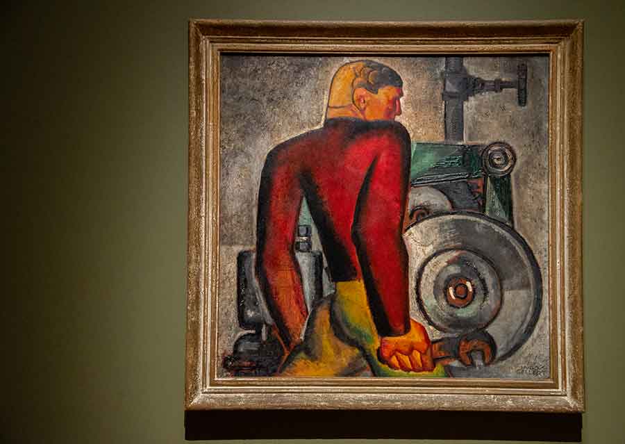 Hugo Gellert (1892–1985), Worker and Machine, 1928, oil on board, 30 1/2 x 30 7/8 inches. Collection of Sandra and Bram Dijkstra. Photo by Deborah Miller.