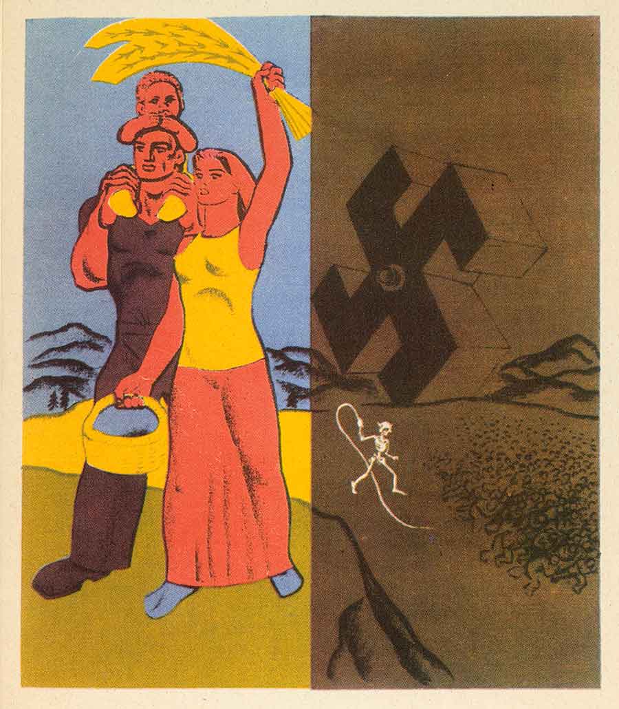 Hugo Gellert, Free World or Slave World from Century of the Common Man, 1943. © Hugo Gellert; Courtesy of the estate of the artist and Mary Ryan Gallery, New York. Gellert contrasts the idealistic propaganda that the Third Reich produced and the reality of fascism.