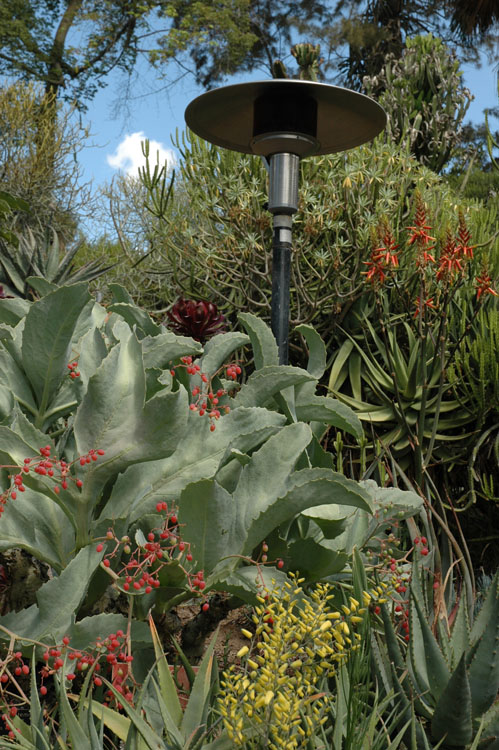 Freezing temperatures are a rare occurrence in San Marino, but when they hit they can be devastating to some of the plants in the botanical collections, including many rare cacti and succulents. In the Desert Garden, heaters are used in certain locations during periods of extremely cold weather to protect some of the most vulnerable and sensitive species that are growing in the outdoor beds. You may have seen these heaters in the upper portion of the garden, interspersed among the plants from Madagascar, Africa, and the Arabian peninsula. They were funded in part by a grant from the Kenneth T. and Eileen L. Norris Foundation in 2007.