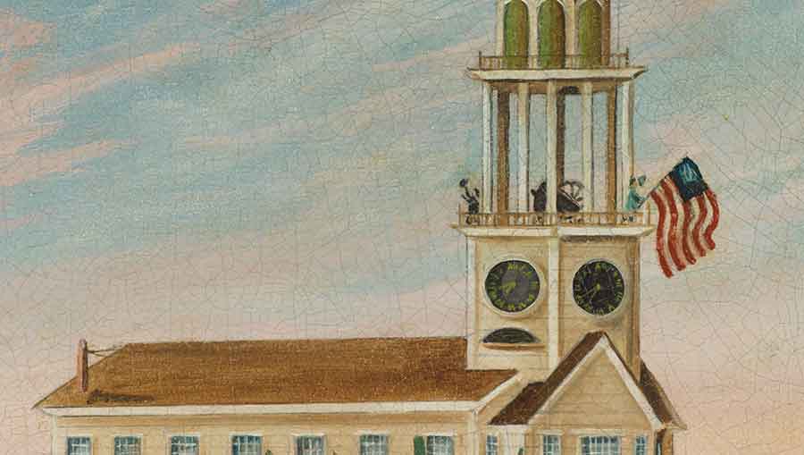 Before the Burning of the Old South Church in Bath, Maine by John Hilling, ca. 1854, oil on canvas, 21 3/4 x 27 7/8 x 2 1/8 in. (55.2 x 70.8 x 5.4 cm.). Jonathan and Karin Fielding Collection. The Huntington Library, Art Museum, and Botanical Gardens.