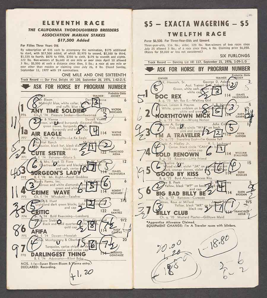 Racing program for Los Angeles County Fair in Pomona, California, September 19, 1977, annotated by Charles Bukowski. The Huntington Library, Art Museum, and Botanical Gardens.