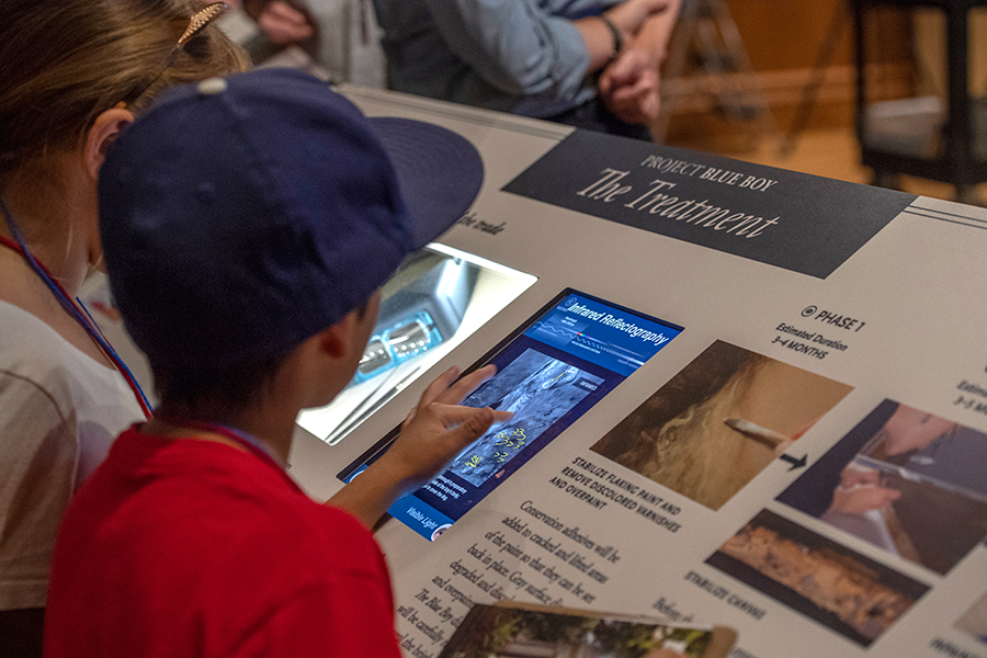 Student interacting with the infrared refractology image of The Blue Boy on a display in the Thornton Portrait Gallery. Photo by Martha Benedict.