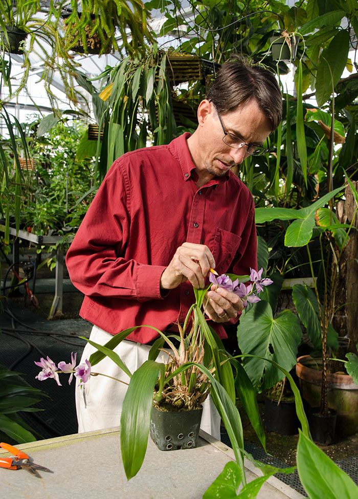 Dylan Hannon oversees The Huntington's tropical collections, which include thousands of orchids. Here, he inspects Zygonisia Cynosure 'Blue Birds' in one of the greenhouses. Photo by Lisa Blackburn.