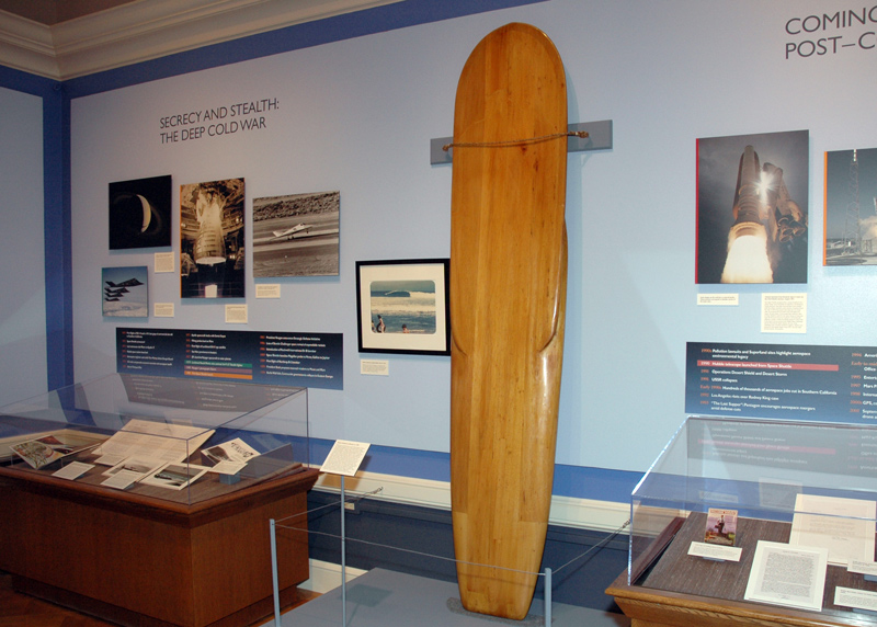 "There's always been a kind of ferment here in California that encourages creative thinking," says co-curator Peter Westwick, "whether it's in designing an airplane or shaping a surfboard." Westwick says that the world of surfing has also influenced the aerospace culture, where more often than not the fun-loving spirit found among math whizzes, engineers, and pilots belied the stereotype of nerds with horn-rimmed glasses and pocket protectors.