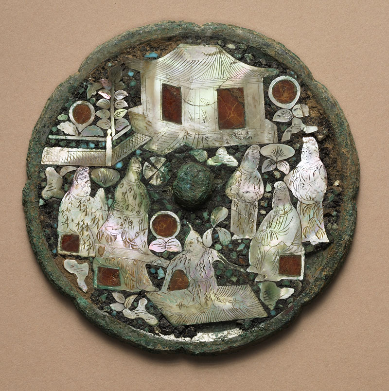 Eight-Lobed Mirror Inlaid with Mother-of-Pearl, Turquoise, and Amber Showing Scene of Musicians and Foreign Dancer; China, Tang dynasty (618–907). Photograph by Bruce M. White, 2009.