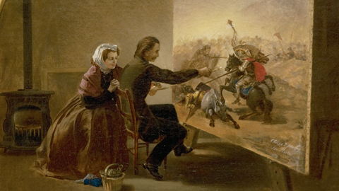 A smallish painting by a relatively unknown artist named John Harrison Mills (1842–1916) in the exhibition "Taxing Visions: Financial Episodes in Late Nineteenth-Century American Art" gives everyone a chuckle. Artist Painting a Satirical Painting (ca. 1870–80s) shows a spare, dim studio dominated by a large canvas on an easel. An artist aims his brush at the canvas, which depicts the medieval battle described above. Next to him sits a rapt woman (perhaps a client?) who clasps her hands and leans forward in eager awe of the artist and the work. The satire might be simply about artists and the kind of fluff they have to produce to impress patrons. But there's more. Painted in small white letters over each of the hero's armored opponents is a label. One is "Rent," another "Bills," and a third, on the one who looks most likely to deal the death blow, is "Taxes."