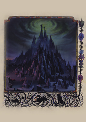 For the illustration of Maleficent's castle, Marieka Kaye used an adhesive to repair the chipping of the carbon-based paint. Image courtesy of the Disney Archive.