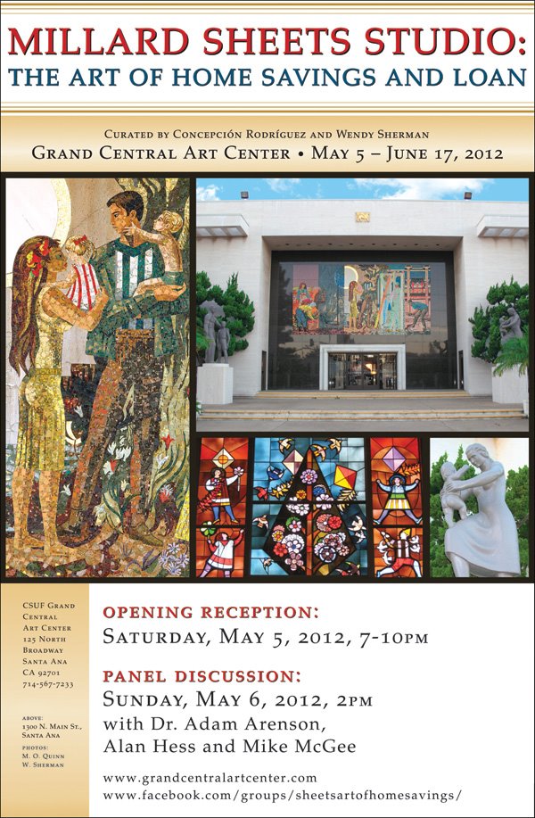"Millard Sheets: The Art of Home Savings & Loan" is on view May 5 through June 17, 2012. The exhibition highlights the murals from the Home Savings & Loan buildings in Temple City, Rolling Hills Estates, Anaheim, Pomona, and Santa Ana. For more information, visit the website of Cal State Fullerton's Grand Central Art Center.