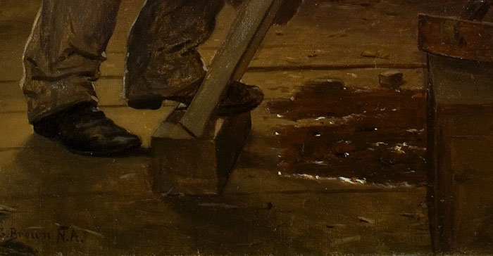 A puddle from the wet deerskin glistens at the scraper’s feet. Detail of John George Brown’s Scraping a Deerskin (also known as Preparing a Deer Hide), 1904, oil on canvas. The Huntington Library, Art Collections, and Botanical Gardens.