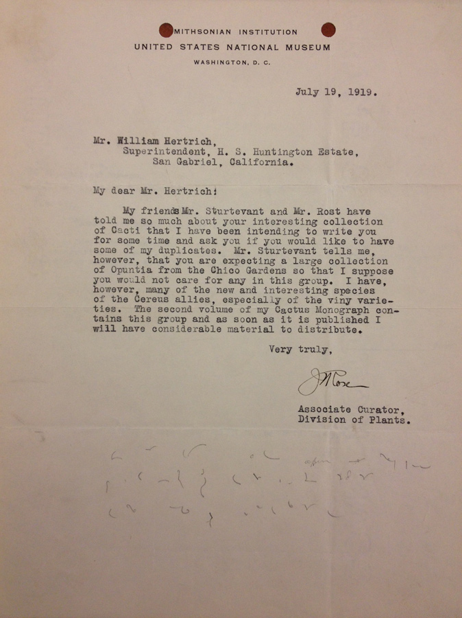 In the early part of the 20th century, many of the great cactus and succulent researchers of the day would send plant material to William Hertrich, the legendary superintendent of Henry E. Huntington’s grounds from 1905 to 1948. Foremost among these cactus experts was Dr. Joseph Nelson Rose, an American botanist at the U.S. National Herbarium.