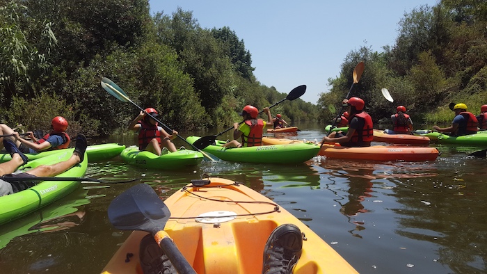 A group of LASA students kayaks along the Los Angeles River in the Sepulveda Basin, August 2016. Photo by John Lee.