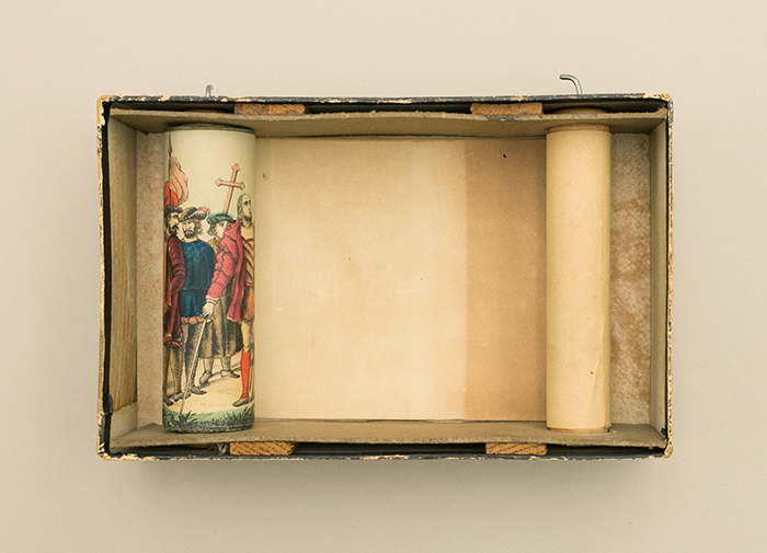 The Huntington’s Historiscope, viewed from the back, reveals the long paper scroll of the panorama wound around rollers.The panorama is framed by an illustration of a miniature theater—complete with balconies, curtains, stage lights, and theatergoers—and the whole contraption is only about 8 inches wide. During its heyday, the toy came with little tickets for attendees and an educational lecture to accompany the visuals. (The Huntington’s specimen doesn’t include the lecture or tickets.) Pre-cinematic “edutainment” at its finest!