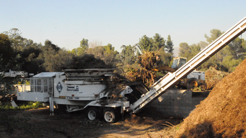 Since arrival, Yeager has pulverized every leaf, branch, trunk, and root mass that has succumbed in the Gardens. Amazingly, Yeager also can grind bamboo, palm leaves, and trunks, and even massive cactus corpses. To top that off, we toss any damaged palettes and waste wood into the mix. The only finicky aspect of Yeager's diet is the need to balance courses—a hopper of dry and twiggy material needs to follow a bulky trunk or root mass. Some nice moist grass clippings help keep the dust down and give moisture to the final product. Like Lilliputians, six or more staff and three or four other named machines spend about a day a month feeding Yeager our tangled masses of brush, which gradually become mounds of mulch to nourish the soil.