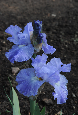 The heat spell made me glad we got the irises planted a couple weeks ago, while the weather was still cool. It would have been brutal setting out and planting that many containers in the full sun of last Thursday. But the new irises are already getting established and the work is paying off with green fans showing a rainbow of floral gratitude—yellow, blue, violet, peach, white. Though no symbolism was baked into the scheme, I was thinking today that our new arc-shaped bands of irises play on the very meaning of the word "iris," which refers to the rainbow and the Greek goddess whose symbol it was.