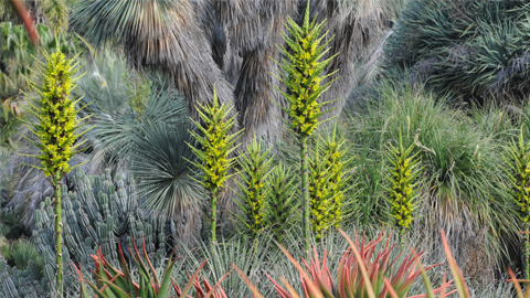 Heading down to the Desert Garden, however, there is yet another rainbow in progress. We are coming up on mid-puya season. Due partly to the simple need for a lot of space to accommodate these spreading bromeliads, nowhere else will you get to know puyas the way you will at The Huntington. We allocate luxuriant amounts of space to these spectacular plants. This week the payoff is solid lime-colored flowers, moving within days to flowering of the metallic turquoise-blue Puya alpestris. Deep in the garden, midnight blue forms are developing, and near the south entrance yet other bold colors soon will add to the show. Alongside those southern plantings are the orange-flowered dyckias, which, like the puyas, are spreading bromeliads that require a lot of territory. It's R-O-Y-G-B-I-V with a vengeance.