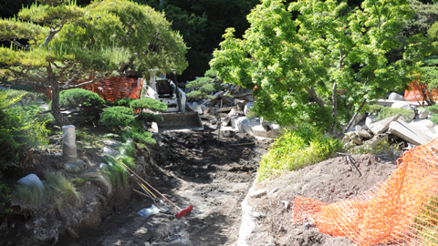 David MacLaren, horticultural curator of the Asian Gardens, explained today that we now know the answer, or at least some of it. Work to remove old concrete began last week in the lower ponds, with crews just reaching the two upper ponds in the last couple of days. And indeed, after knocking out a comparatively thin pond bottom in the first of these upper ponds (the one with a small island and pine tree), workers encountered a sandwich of moist soil on top of a solid concrete second bottom, one that is clearly the original floor of the pond. Now we know—it is no myth that this upper pond has a false bottom.