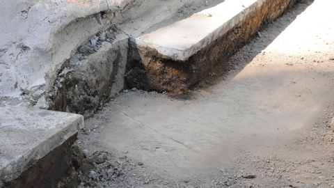 But that doesn't especially mean the rest of the myth is true. It's not credible that gardeners would have simply formed a new concrete bottom rather than removing mud carried in during a storm. We have never been that afraid of work, and we have sacked that much soil out of ponds many times. Inspecting the original pond floor, it is seriously cracked and damaged. Perhaps when that was determined, rather than removing and replacing the original concrete, the decision was made to abandon the cracked bottom and create a new upper waterproof slab, cushioned with compacted soil.