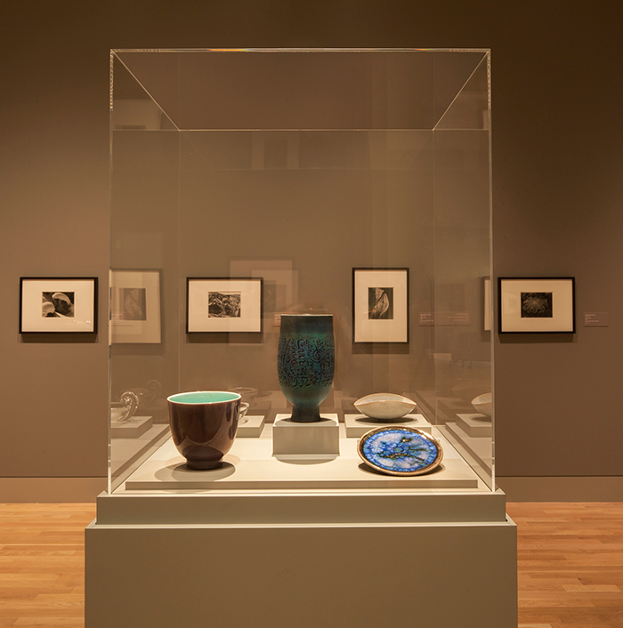 In another new room, photographs by Edward Weston (in background) are accompanied by decorative arts, including Footed Bowl, ca. 1945, by William Manker; Footed Vase, ca. 1967, by Edwin and Mary Scheier; Colemanite Blue, ca. 1965, by Faith Zink Porter; and Folded Bowl, ca. 1960, by Otto and Gertrud Natzler. The Huntington Library, Art Collections, and Botanical Gardens. Photo by Tim Street-Porter.