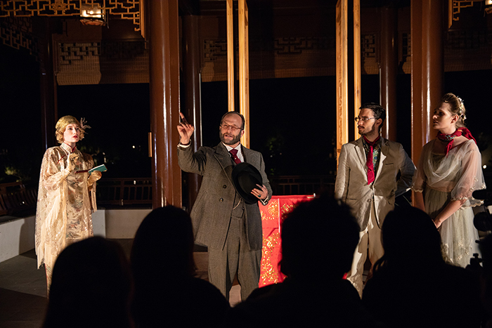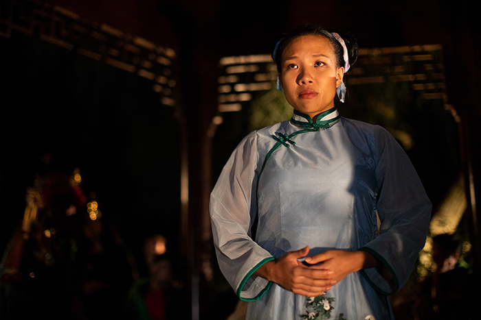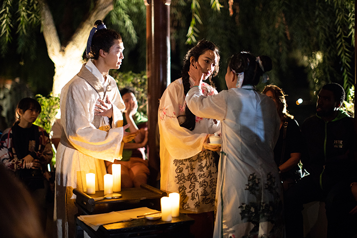 Audiences in separate groups follow lantern-bearing guides through the Chinese Garden, viewing scenes on bridges, in the graceful pavilions, and on pathways through shadows cast by massive limestone rocks. One group first sees the play in the setting of 16th-century China; the other group’s perspective is 1920s Southern California. (Henry Huntington, portrayed by CalArts faculty member Adam Smith, appears; Gainsborough’s The Blue Boy, The Huntington’s iconic painting, is a haunting element.) At the halfway mark, the groups change places. “You see all the scenes in their entirety,” Lai notes, “no matter which direction you go, but in a different sequence. It really is a journey.”