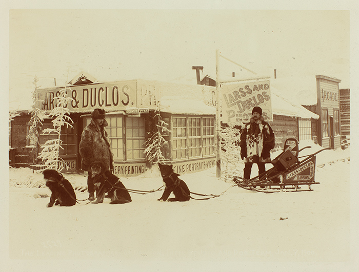 Joseph E.N. Duclos (1863–1917) and Per Edward Larss (1863–1941) in front of their Dawson City photography studio, with dog team and Larss & Duclos sled, around 1898. Unidentified photographer. The Huntington Library, Art Collections, and Botanical Gardens.