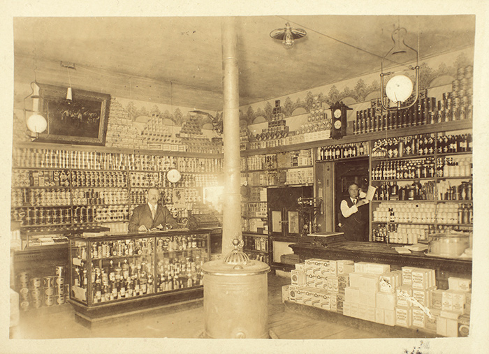 This photograph likely depicts J. H. F. Ahlert and C. L. Forsha in their Ahlert & Forsha grocery store in Dawson City in 1910. Unidentified photographer. The Huntington Library, Art Collections, and Botanical Gardens.