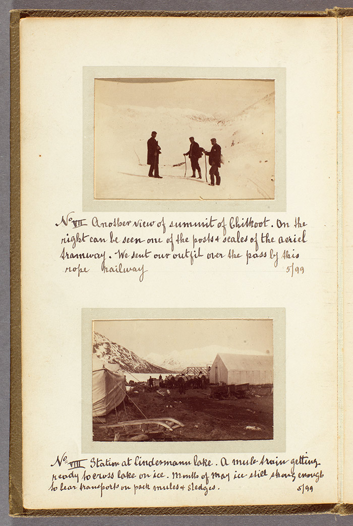 A page from Alfred and Charles O’Meara’s photograph album showing the men on the summit of the hazardous Chilkoot Pass and at Lake Lindeman, May 1899. Stampeders tackled the pass by climbing the so-called “golden staircase,” 1,500 steps carved into the snow and ice. At the end of the pass was Lake Lindeman, near the headwaters of the Yukon River. Unidentified photographer. The Huntington Library, Art Collections, and Botanical Gardens.