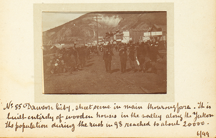 Detail of a page from Alfred and Charles O’Meara’s photograph album showing a street scene in the bustling boomtown of Dawson City, June 1899. Unidentified photographer. The Huntington Library, Art Collections, and Botanical Gardens.