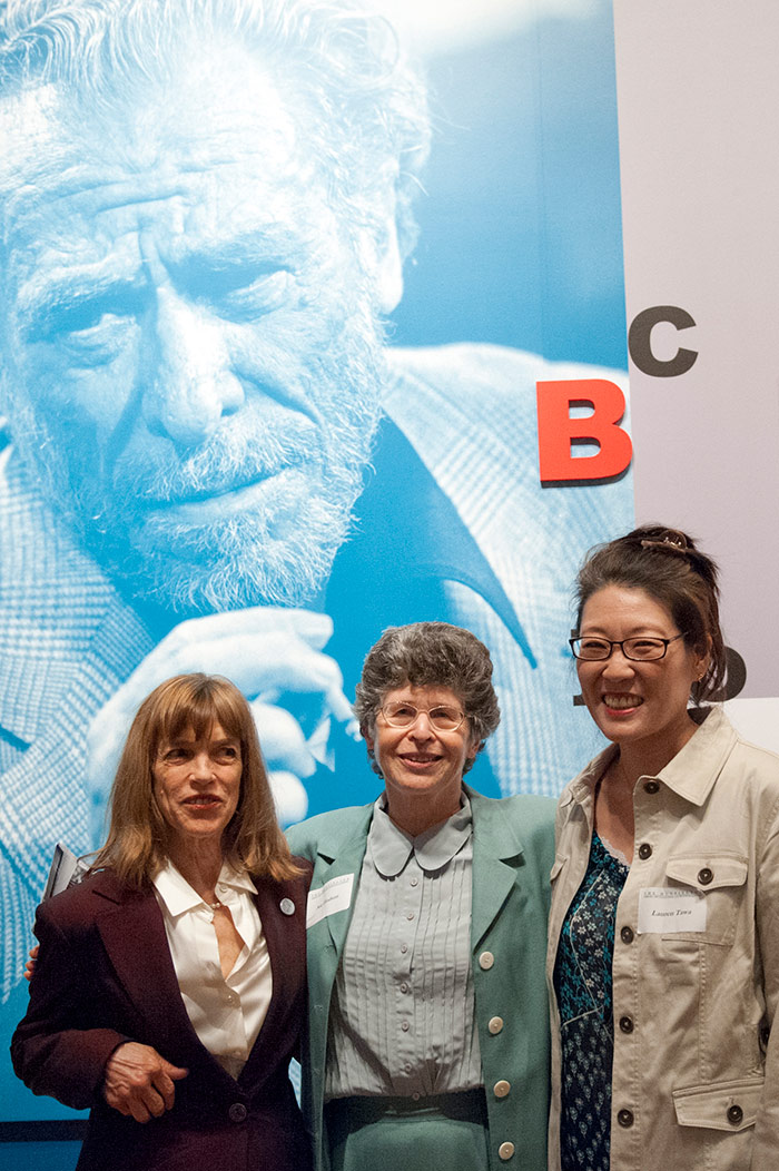 Linda Lee Bukowski (left), wife of the late poet Charles Bukowski; Sue Hodson (center); and exhibitions’ preparator Lauren Tawa (right) pose in front of the title wall of the exhibition “Charles Bukowski: Poet on the Edge,” Oct. 10, 2010. Photo by Martha Benedict.