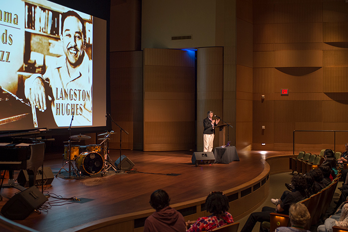 Hodson talks to high school students before a performance of Langston Hughes’s “Ask Your Mama: 12 Moods for Jazz,” which was read by Ron McCurdy, a professor of music at the USC Thornton School of Music, and accompanied by a musical score composed by McCurdy and performed by his jazz quintet, April 14, 2016. Photo by Martha Benedict.