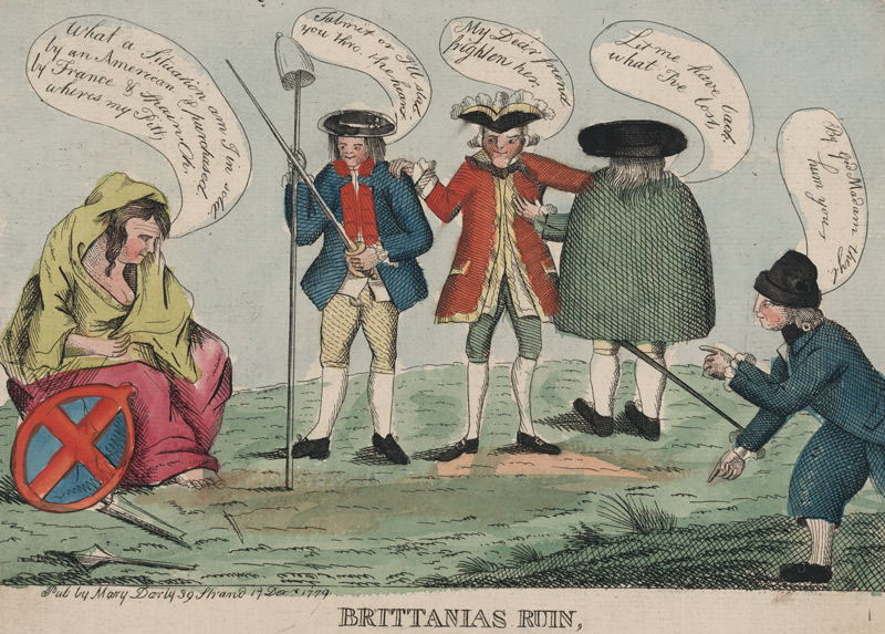 “Britannia’s Ruin,” published by Mary Darly, Dec. 17, 1779, hand-colored etching, British Cartoon Prints Collection, Library of Congress.
