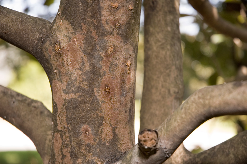 The trunk of a Camellia semiserrataspecimen bears tell-tale entry and exit marks surrounded by mounds of frass (the digested waste excreted by the insects). Photo by Lisa Blackburn.