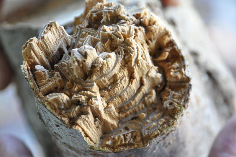 A cut branch shows two Y-shaped galleries created by the female beetle boring into the wood of the camellia branch. Photo by Lisa Blackburn.