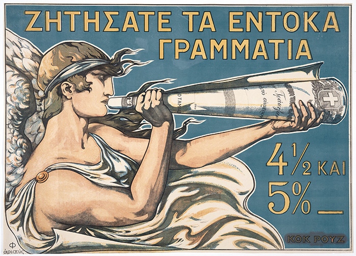 ΖΗΤΗΣΑΤΕ ΤΑ ΕΝΤΟΚΑ ΓΡΑΜΜΑΤΙΑ 4½ KAI 5% [Ask for Treasury Bills 4½ to 5%], ca. 1917. Unknown artist. United States, lithograph on paper, 21¾” x 30¼”. Gift of Jay T. Last. A winged classical goddess grabs the viewer’s attention as she implores her compatriots to buy into the cause on this poster distributed to Greek-American communities in the United States. The Huntington Library, Art Collections, and Botanical Gardens.