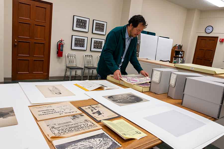 Rosten Woo studies landscape drawings produced during an expedition led by John Russell Bartlett (1805–1886). Bartlett was hired in 1850 to survey the border between Mexico and the United States after the Mexican American War (1846–1848). Photo by Kate Lain.