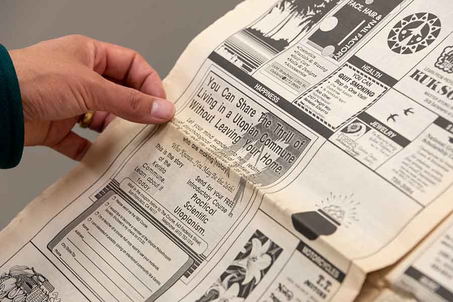 Woo reads an advertisement for a utopian commune in a newspaper from the Robert Hine Collection. Photo by Kate Lain.