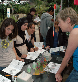 Docent Carol Hunt helps students from Bloomington Middle School in Colton collect clues to solve a botanical mystery in the popular school program "CSI: Conservatory Science Investigation"
