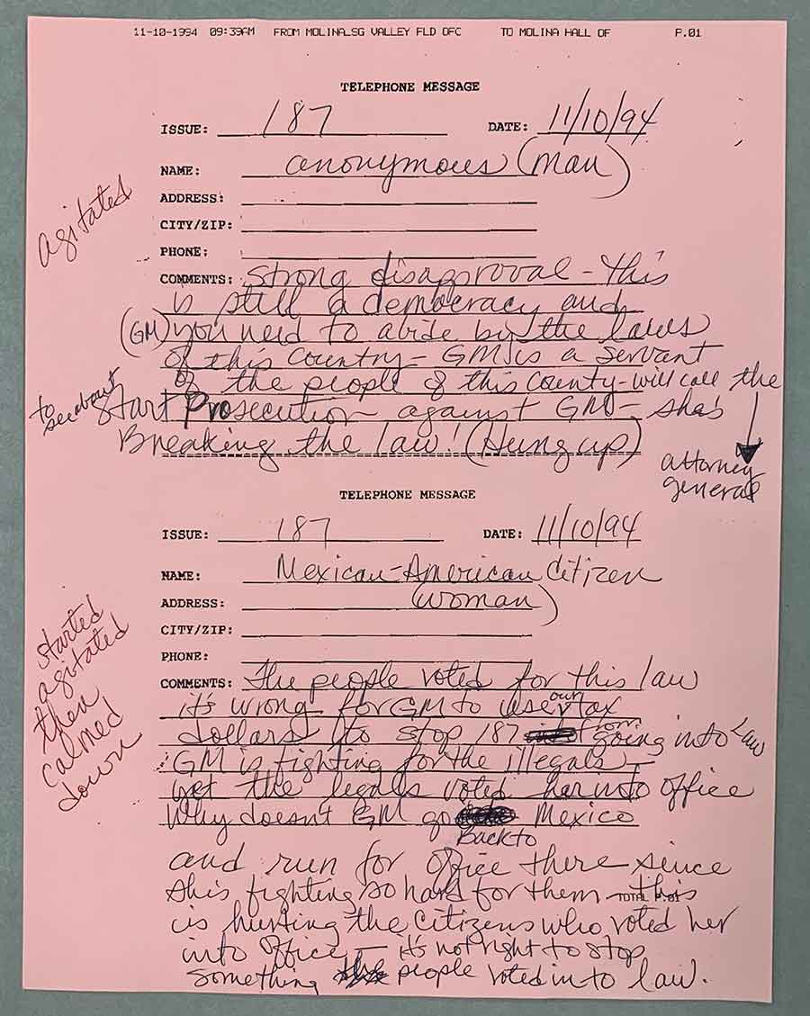 Messages for Gloria Molina from anonymous callers regarding Proposition 187, Nov. 10, 1994, manuscript in ink on printed paper. Gloria Molina Papers. Gift of Gloria Molina, 2014. Huntington Library, Art Museum, and Botanical Gardens.